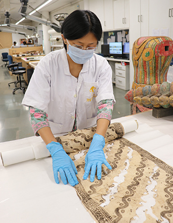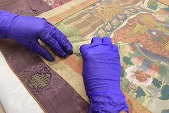 Every textile that comes to the division for treatment is carefully examined for its conservation needs. The goal of the textile conservator is to provide stabilization and support, and minimize further deterioration. This may include both curative conservation from surface to wet cleaning, stabilization through stitching or adhesive treatments and preventive recommendations, such as supportive storage or environmental guidelines or hanging/mounting options.